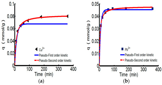 Adsorption kinetics experiments were carried out by blending 0.10 g adsorbent with 20 mL Cu2+ or Pb2+ solution (0.94 mmol/L). The samples were shaken at 25 °C for 10 min, 20 min, 40 min, 60 min, 90 min, 180 min, and 360 min, respectively.