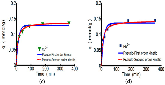 The kinetics curves of ChW and PTW. (a) ChW-Cu2+; (b) ChW-Pb2+; (c) PTW-Cu2+; and (d) PTW-Pb2+.