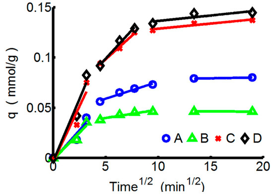 Weber-Morris model is applied to determine the rate-limiting step in this adsorption system, which represents the time dependent intra-particle diffusion of the solvend. If the Weber-Morris curve of q (mmol/g) against t0.5 (min0.5) gives a straight line, the adsorption process is diffusion controlled. If the plot is multi-linear and the lines do not pass through the origin, then a combination of two or more processes influence the adsorption [36].