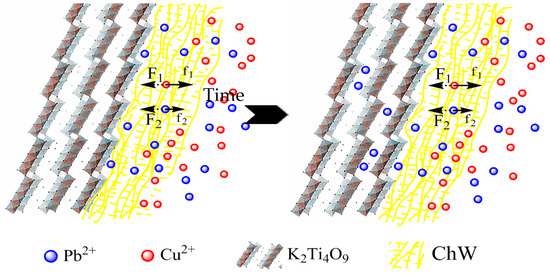 When Cu2+ and Pb2+ contacted with the composite material ChW-PTW, the ChW film could catch Cu2+ firmly and block Cu2+ from entering into the PTW layer. Most of the chelation sites of ChW could be occupied by Cu2+. On the other hand, Pb2+ would adsorb on the ChW layer prior to Cu2+, but the adsorption capability (kF) and diffusion rate (kind2) of Pb2+ on ChW was less than Cu2+, moreover, the diffusion rate (kind2) of Pb2+ on PTW was much larger than on ChW. Then partial Pb2+ chelated on the residual active sites of external ChW film quickly, other Pb2+ would continuously transfer into the interior-ChW-PTW and adsorbed on the PTW layer by ion exchange. The possible separation process and mechanism of the double-ion-mixed solution is revealed in the Figure 6.