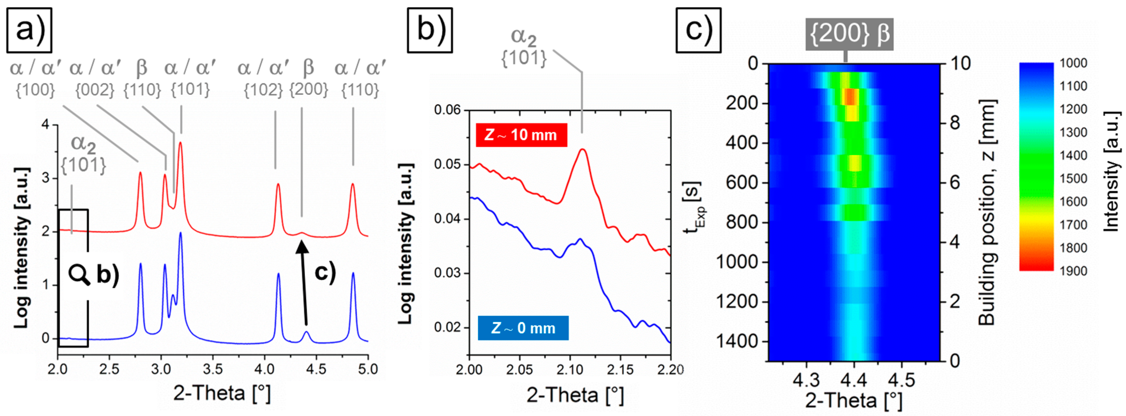 - Structural evidence of the formation of the intermetallic α2-Ti3Al phase is revealed by high-energy synchrotron X-ray diffraction along the building direction of the sample as well as by TEM performed at a central region of the samples.