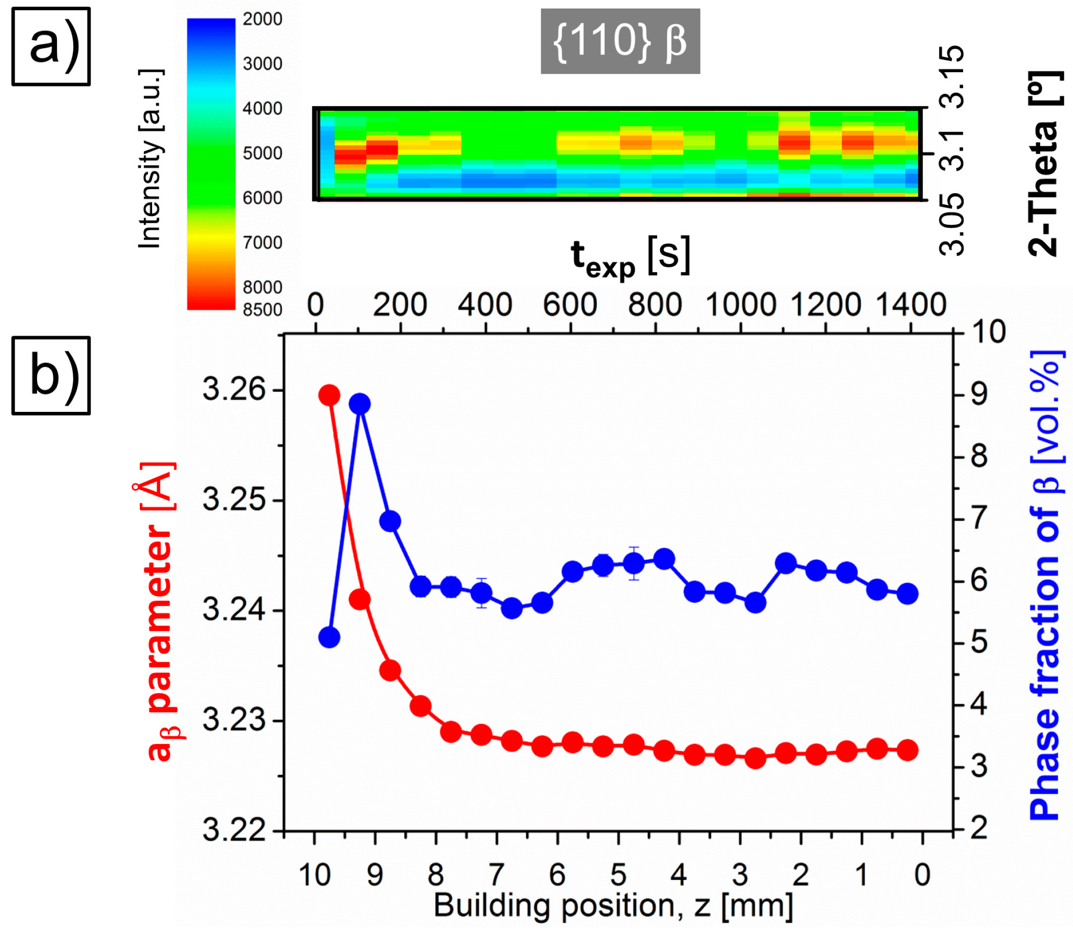 - The evolution of the lattice parameter of β, aβ, indicates a gradual variation in the IHT-induced element partitioning between β and α’/α along the building direction of the sample. Decreasing aβ values are presumably associated with a progressive partitioning of V to β. The results obtained establish aβ as an indicator for the microstructural degree of stabilization of the SLM Ti-6Al-4V alloy.