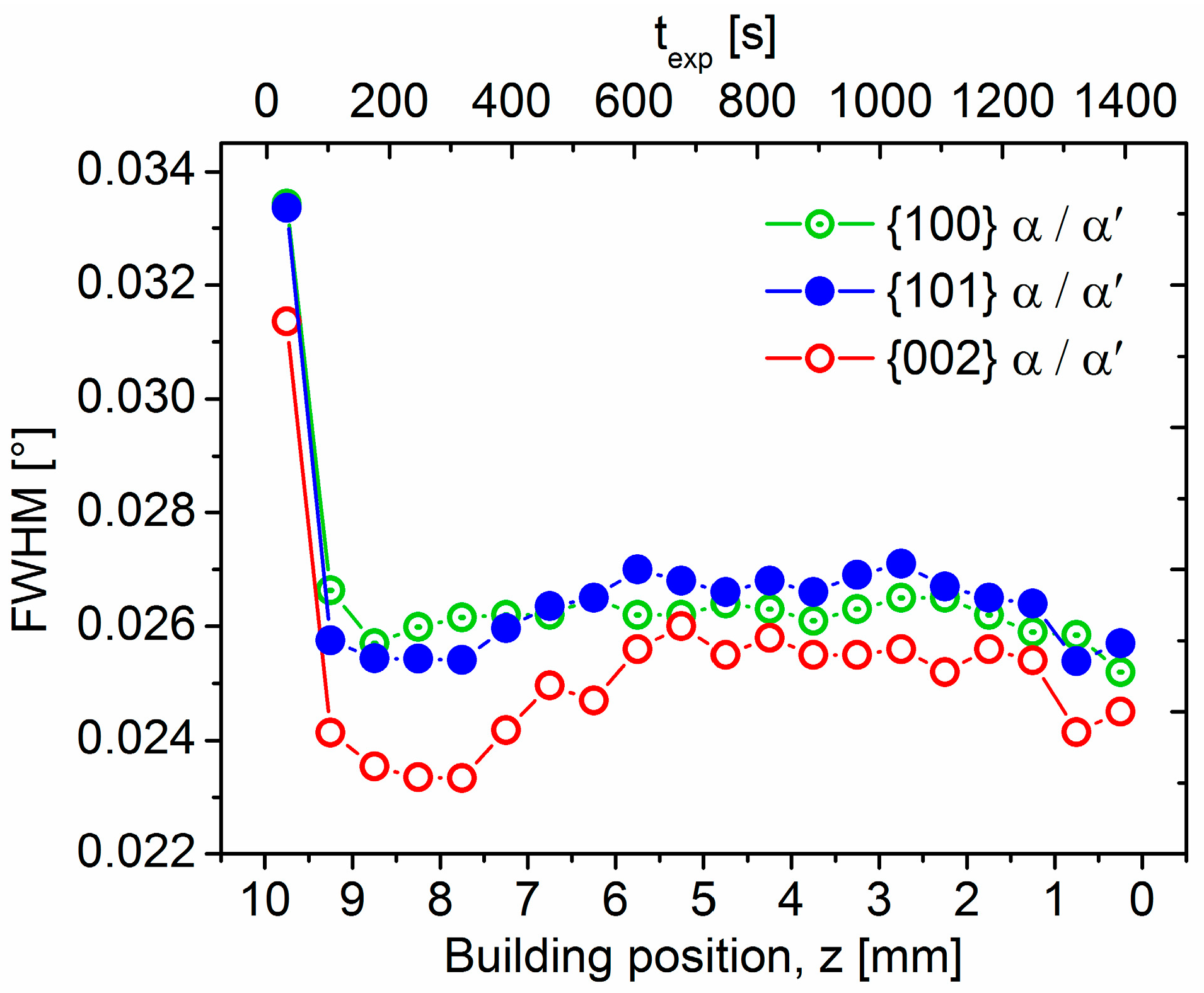 - A relatively thin martensitic layer (~150–250 µm) forms for the lastly synthesized layers of material as a consequence of the IHT influence at T > Ms. The transition from α’ plates to stable α lamellae is reflected along the building direction by an abrupt decrease of the full width at half maximum of hcp reflections as well as by the microhardness evolution.