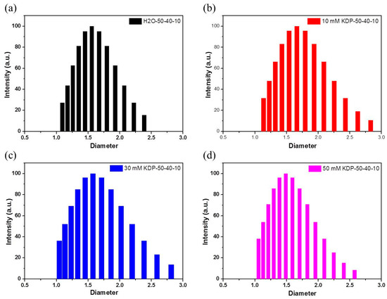 Size distribution of micelles in traditional W/O microemulsion (a) and functional KDP aq/O microemulsion with different cKDP (b–d).