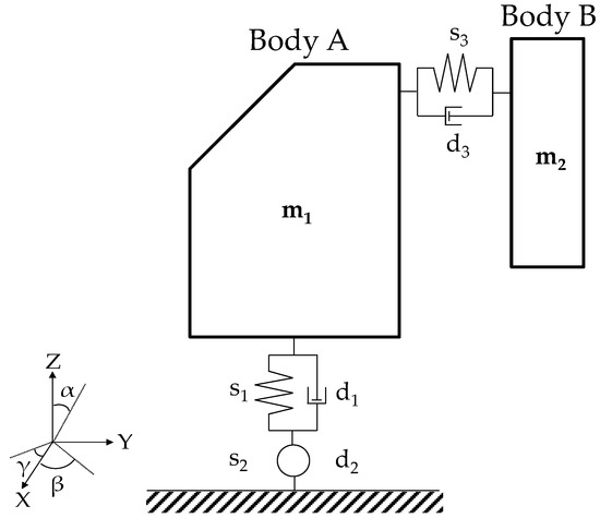 Body A, with the mass equal to m1, has three rotational degrees of freedom (DOFs) constrained to the basement. These DOFs allow evaluating its natural frequencies. In this way, a simple finite segment method (FSM) may model the stiffness using one rigid mass and three springs for each degree of freedom. This approach is based on modelling a flexible body as a finite number of rigid elements that are linked by dampers and springs. This requires the use of rigid multibody formulations. The spring s1 defines the bending in the Z-axis, s2 describes the torsion around the Y-axis, while s3 shows the inflection in the X-axis. The dampers di (i = 1, 2, 3) regulate the resonance, without influencing the natural frequencies of the body. It is assumed that the translational movement of body A is not permitted.