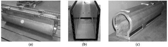 In order to compare the lightweight structures, a set of prototypes was fabricated. The prototypes represented the Z-axis ram (300 mm × 1500 mm) of a commercial milling machine and they were made of aluminium foam sandwiches, in closed-cell configuration, corrugated-core sandwiches, and CFRP material, respectively. Figure 3 shows an overview of the three prepared samples. The prototype dimensions were designed satisfying the MT requirements, guaranteeing that natural MT vibration frequencies passed at least 50 Hz. The vertical axis prototypes were equipped by commercial guideways, reproducing the same characteristics of the final version of a machine tool element. A number of structural versions were studied using FE simulations in order to satisfy the required structural properties. Figure 3 illustrates the final prototype design validated by the finite element analysis (FEA), avoiding any potential technical issues or defects and, as a consequence, an increase of the experimental campaign costs.