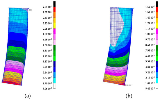 FE model of AFS structure: the deformed shape (μm) in the X orientation (a) and in Y orientation (b), applying a static load of 60 N at tool tip point.