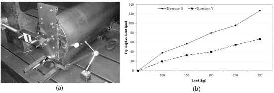 The experimental procedure consisted of controlling the static force by acting on a screw, avoiding peak or step stress. The corresponding deflections were measured at the tool tip point by a number of dial gauge sensors. Finally, the stiffness was quantified, calculating the ratio between the force and the corresponding displacement at the application point. Figure 5a illustrates an overview of the test bench used to execute the static tests. The applied forces varied over a range from 10 kg to 300 kg. Figure 5b highlights an example of the results obtained from the AFS ram.