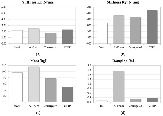 Corrugated-core sandwiches are another valid alternative to guarantee bending stiffness and strength when minimal mass is required. These Al sandwich panels are structurally lightweight, offering 30%–40% of weight savings compared with conventional structures. The lightness of the panels is achieved through the layer build-up, which permits incremental wall thicknesses of the structure. They have a broad range of applications; in particular they are suitable to improve the stiffness and reliability of constructions, absorbing energy during blasts and impacts [35,36,37,38,39]. The composite materials reinforced by carbon fibres (CFRP)) are particularly interesting for applications in machine tool structures due to their ratio of mechanical strength to density [40,41]. CFRP materials consist of a binding matrix system and a reinforcement of fibres or particles.