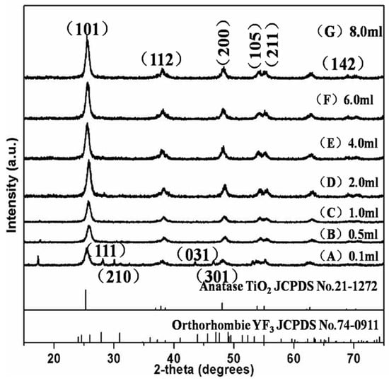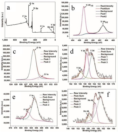 All chemicals were used as received without further purification. Y2O3 (99.999%, Chengdu Kelong Chemical Co., Ltd., Chengdu, China), Ho2O3 (>99.9%, Shanghai TongNai Environmental Protection Co., Ltd., Shanghai, China), NaF (Chengdu Kelong Chemical Co., Ltd., Chengdu, China), ethanol (Chongqing Chuandong Chemical Group Co., Ltd., Chongqing, China), ethylenediamine tetraacetic acid (EDTA) (Chongqing Boyi Chemical Co., Ltd., Chongqing, China), acetic acid (CH3COOH) (Chongqing Chuandong Chemical Group Co., Ltd., Chongqing, China), and tetrabutyltitanate (TBOT) (Chengdu Kelong Chemical Co., Ltd., Chengdu, China) were of analytical grade.