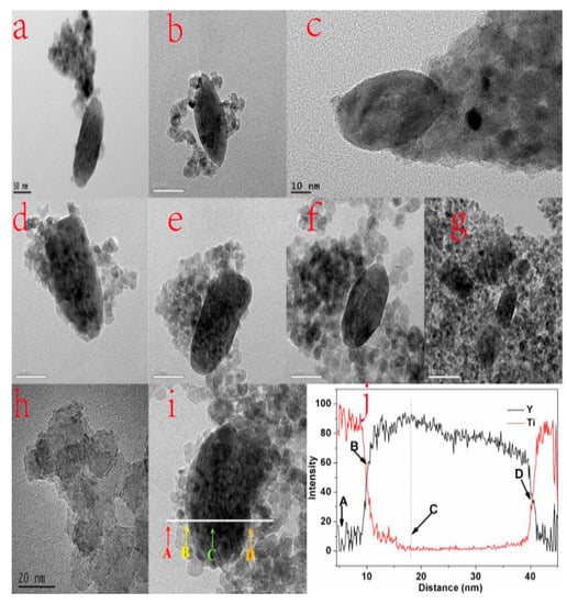 2O (4.0 mL) to form precursor B. After that, precursor B was added dropwise into precursor A at a rate of 1 mL/min while stirring for 1 h. After standing for 24 h, the resulting nanoparticles were dried at 105 °C, and then calcined by a heating rate of 2 °C/min to 400 °C for 2 h. The experimental parameters of the TBOT dosage and the hydrolysis reaction time are shown in