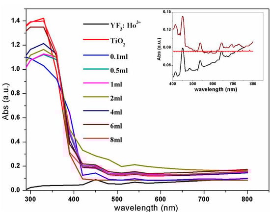 2, the upconversion luminescence capacity becomes weaker. This may be due to the fact that the UV light emitted by the UCL after absorbing visible light would be absorbed by TiO