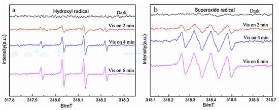 2− are obvious and clear. The intensities of these two radicals’ signals increase considerably after irradiation for 6 min. Hence, the ·OH and ·O