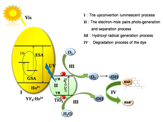 In summary, YF3:Ho3+@TiO2 can be successfully prepared using a simple hydrothermal method. By analyzing the XRD images, we found that almost all the samples showed the diffraction peak of anatase TiO2 and that the crystal structure of the material did not change with TBOT dosage. TiO2 was uniformly doped on UCL, and the particle size was about 10 nm. The rice-shaped UCL material had good dispersion, of which the particle size was about 100 nm. The change of TBOT dosage would not cause the change of the material morphology, but would cause the change of the amount of TiO2 doped on UCL, resulting in an impact on the photocatalytic activity of YF3:Ho3+@TiO2. The composite material prepared in this paper shared the same upconversion luminescence property with the UCL material prepared by Jun. It confirmed that the material prepared in this paper could absorb 450 nm visible light and emit UV light, with energy transferred from YF3:Ho3+ to anatase TiO2. With the increase of the TBOT dosage, more TiO2 would be doped on the YF3:Ho3+, therefore the excitation light was obstructed, resulting in a lower energy of exciting light. The photocatalytic properties of the YF3:Ho3+@TiO2 was evaluated by the degradation of RhB and compared with those of traditional photocatalysts such as P25, TiO2, and the visible light photocatalyst BiVO4. The results showed that the prepared composite material exhibited better photocatalytic properties as compared with the other three photocatalysts. With the increase of the TBOT dosage, the photocatalytic efficiency of composite YF3:Ho3+@TiO2 first increased and then decreased. When the TBOT dosage was 6 mL, the photocatalytic efficiency reached the highest value, which was 67%. The results of this paper indicated that Ho3+-single-doped hexagonal YF3 could absorb visible light and emit UV light via UC processes. Under UV light irradiation, the composite material YF3:Ho3+@TiO2 could exhibit better photocatalytic properties than that of anatase TiO2, therefore the prepared composite material YF3:Ho3+@TiO2 has promising applications in photocatalysis.