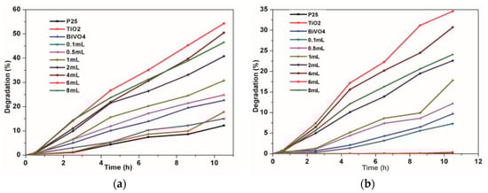 2 with different dosages of TBOT on RhB and phenol degradation, respectively. All the samples have almost zero adsorption efficiency both for RhB and phenol, wherein the most significant one is less than 1%. For the RhB and phenol, the photocatalytic degradation efficiency first increases then decreases with the increase of the TBOT dosage. When the dosages of TBOT are 6 mL, it can obtain the highest degradation efficiency (67%) of RhB as well as the highest degradation efficiency (34.6%) of phenol. According to the analyses above, this could be due to the fact that when the TBOT dosage increased, more TiO