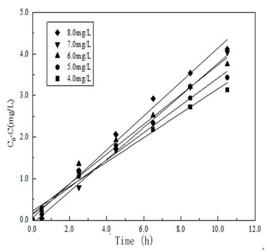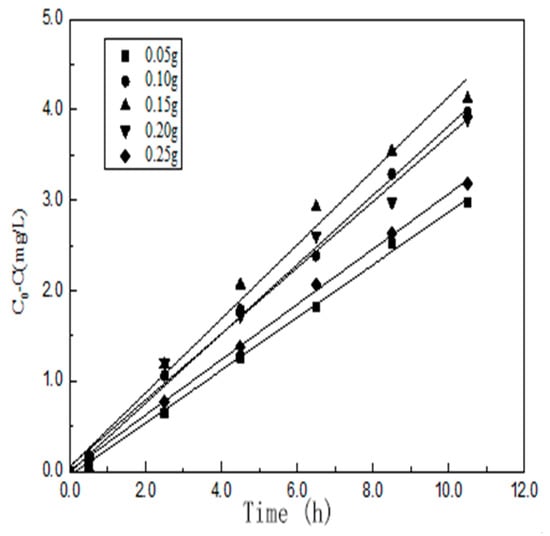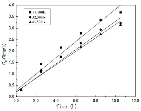 Figure 11 shows how different irradiation intensities affect the photocatalytic efficiency. When the irradiation intensity reaches 141,500 lx, each factor is at its best level, the RhB is degraded completely, and the process is not a zero order reaction. Therefore, in this paper, only the irradiation intensities of 87,100 lx, 52,300 lx, 43,500 lx were considered. With the increase of irradiation intensity, reactions between the photocatalyst and photon will increase and the rate of the photocatalysis reaction will be faster, thus leading to an increased efficiency. After fitting, an equation can be obtained as shown below.