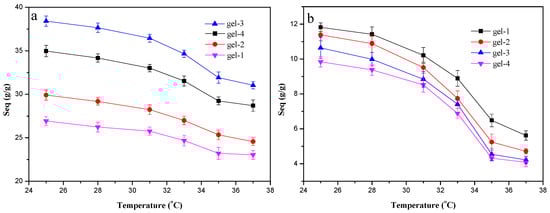 The swelling ability determined the physical properties and applications of hydrogels. To study the influence of the hydrogel composition (DS of MAHX) and environment conditions (temperature and pH) on the swelling ratio of hydrogels, a systematic study on the swelling characteristic was carried out and the results are shown in Figure 1. The Seq values of MAHX-based hydrogels (MAHX-gels) in pH 7.4 at different temperatures were illustrated in Figure 1a. Obviously, the Seq was affected by the temperature and the DS of MAHX. The Seq of all the samples were decreased with the increase of temperature from 25 °C to 37 °C. Besides, the fastest decline in the Seq of hydrogels occurred from 33 °C to 35 °C, revealing that the LSCT of hydrogels was distributed between 33 °C and 35 °C. This could be explained by the fact that when the temperature was above the LCST, NIPAm moieties became dehydrated, leading to the shrinkage of the network of hydrogels and thus decreasing the swelling ratio [30]. The Seq of hydrogels at 37 °C in pH 7.4 firstly increased from 23.03 g/g to 31.03 g/g with the increase of the DS of MAHX from 0.12 (gel-1) to 0.48 (gel-3). However, further increasing the DS of MAHX from 0.48 (gel-3) to 0.65 (gel-4) caused the swelling ratio to decrease. The hydrophilicity of hydrogels could be improved by the modification of xylan and be enhanced by increasing the DS of MAHX and, consequently, increasing the swelling ratio. Meanwhile, when xylan was modified by MAH, due to the introduction of carboxyl groups, many highly active carbon–carbon double bonds were introduced into the xylan backbone. During the hydrogel formation, these carbon–carbon double bonds could cross-link with AA and NIPAm, resulting in a higher cross-link density, reducing the pore diameter of hydrogels, and thus decreasing the swelling ratio [31].