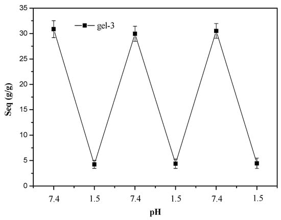 The swelling and deswelling behavior of hydrogels are important parameters used to evaluate its reversibility and durability. Figure 2 illustrates reversible swelling–deswelling behaviors of gel-3 in the buffer solutions with pH 1.5 and 7.4 at 37 °C. When the swollen gel-3 in the buffer solutions (pH 7.4) was transferred into the solution of pH 1.5, the Seq of gel-3 was sharply decreased from 30.86 g/g to 4.25 g/g, 29.95 g/g to 4.38 g/g, and 30.52 g/g to 4.45 g/g, respectively. At a low pH region, the carboxylates (–COO–) in gel-3 were generally protonated to become COOH and thus led to the deswelling of the hydrogel. However, when the hydrogel was transferred into the solution of pH 7.4 again, the COOH became ionized, and the resulting electrostatic repulsion in the network led to the reswelling of hydrogels [32]. After three swelling–deswelling cycles, there was no obvious decrease in the swelling ratio of gel-3 in either pH 1.5 or pH 7.4. This indicated that hydrogels had good durability and reversibility, implying that these hydrogels have potential application in drug-delivery systems. A similar result was also reported for other hemicellulose-based poly (acrylic acid) hydrogels [33,34].