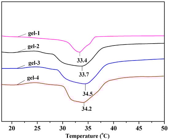 Figure 5 exhibits DSC heating scans of gel-1, gel-2, gel-3, and gel-4. The LCST of gel-1, gel-2, gel-3, and gel-4 emerged at 33.4 °C,33.7 °C,34.5 °C, and 34.2 °C, respectively. The LCST of hydrogels firstly increased with the increase of the DS of MAHX and then decreased. Gel-3 showed the highest LCST of 34.5 °C nearest to body temperature. It could be deduced that the hydrophilicity of the hydrogel networks increased with the increase of the DS of MAHX, increasing the combination of intermolecular forces, especially the hydrogen-bonding interaction between the hydrogel matrixes and water molecules in the system. This implied that breaking of hydrogen bonds required more energy, which made the transition temperature of LCST become higher and broader [42]. Nevertheless, further increasing the DS of MAHX led to the nonuniform cross-linking of the hydrogel network, which led to the decrease in the LCST. Therefore, the DS of MAHX used to prepare hydrogels had an important effect on the LCST of hydrogels. Thus, gel-3 with LCST of 34.5 °C nearest to the body temperature was the most suitable as the carrier for drug controlled release in the biomedical field.