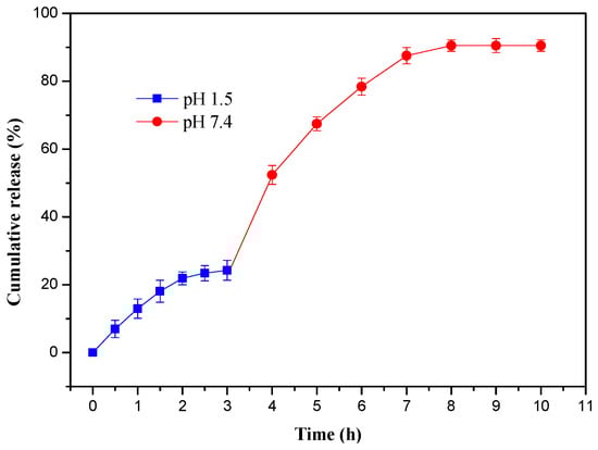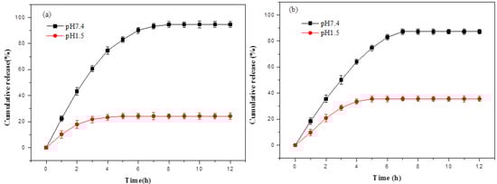 To investigate whether gel-3 had special drug release behavior and whether the type of drug had an effect on the drug-release behavior of gel-3, acetylsalicylic acid and theophylline were used as model drugs for studying the in vitro release behavior of gel-3 at 37 °C. The cumulative acetylsalicylic acid and theophylline release at different pH conditions (pH 7.4 and pH 1.5) are shown in Figure 6. It was found that the release rate of acetylsalicylic acid from gel-3 in simulated intestinal fluids (pH 7.4) increased quickly during the initial 4 h and then slowed down and approached the release equilibrium (Figure 6a). The release equilibrium was achieved at 8 h and the maximum release percentage was 94.56%. While in the simulated gastric fluids (pH 1.2), gel-3 showed a slower and steadier acetylsalicylic acid release rate. The maximum release percentage (24.25%) was achieved within 4 h. The cumulative release value of acetylsalicylic acid in the simulated intestinal fluids (pH 7.4) was higher than that in the simulated gastric fluids (pH 1.5) during the releasing process. This could be attributed to the difference in the swelling ratios of hydrogels in different mediums.