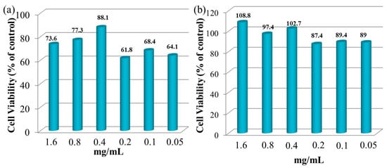 The cell viability assay was conducted by MTT method using NIH3T3 cells to measure the cell proliferation and the cell activity in the solution including prepared hydrogel powder (gel-3). NIH3T3 cells (2 × 103 cells per well) were seeded in 96-well plates (100 µL) and cultivated for 24 h. Then, different concentrations of hydrogel samples (1.6, 0.8, 0.4, 0.2, 0.1, and 0.05 mg/mL) were put into the cells and cultivated for 24 h and 72 h. Then, the medium was removed and 30 μL MTT (5 mg/mL) was added, followed by 4 h of incubation at 37 °C. Then, the supernatant was removed, and 150 µL of DMSO was added to dissolve the formazan precipitate. The absorbance of the solution was measured by microplate reader (Bio-Rad 550, Hercules, CA, USA) at 570 nm to determine the optical density (OD) value. Each group was measured three times and the average taken. The cell viability was calculated by following formula [29]: