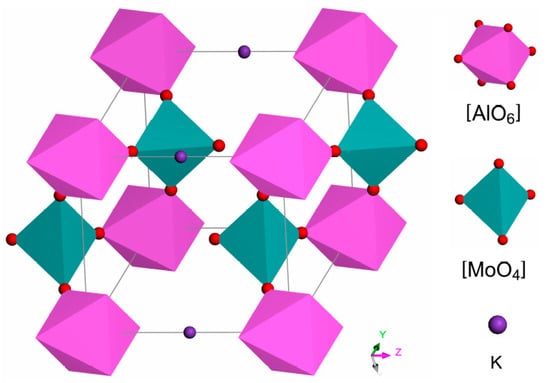 Molybdates and tungstates doped with transition metal or rare earth ions are important compounds that are found to have potential in tunable laser applications [1,2,3]. Double molybdates, with their general formula of MIMIII(MVIO4)2 (MI = alkali metal, MIII = Al, In, Sc, Fe, Bi, lanthanide; MVI = Mo, W), have been studied extensively due to their unique optical and antiferroelectric properties and ferroelastic phase transitions [4,5,6]. Some of its members behave as promising laser host materials for transition metal and lanthanide ions due to their high and continuous transparency in the wide range of the near-IR region. For instance, Cr3+-doped KAl(MoO4)2 crystal has been proven to be a suitable laser host, characterized by high absorption, efficient pumping, and broad laser emission [7]. As a member of MIMIII(MVIO4)2, KAl(MoO4)2 represents the large crystal family with layered structure. It has attracted considerable interest since many compounds of this series exhibit a sequence of ferroelastic phase transitions and are therefore of great importance for basic research [8,9].