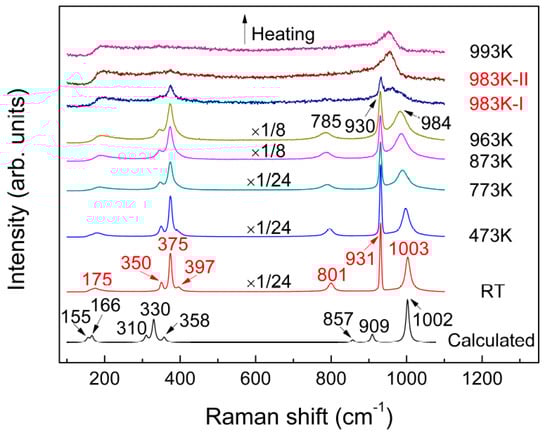 Temperature-dependent Raman spectra of KAl(MoO4)2 recorded from RT to 993 K and the room temperature spectrum calculated by the Cambridge Sequential Total Energy Package (CASTEP).