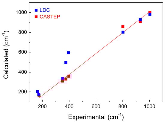Compared with the results predicted by lattice dynamics calculations (LDC) (blue squares in Figure 4, which were carried out by Maczka et al. [8]), the wavenumbers of KAl(MoO4)2 calculated by CASTEP in this work on the basis of DFT is clearly more satisfied. However it is not clear whether this conclusion can be generalized to other molybdate systems. Major differences in intensity between the experimental and calculated results were observed at the peak positions of 909 and 1002 cm−1, which is believed to be due to the precision and limitation of the theoretical simulation methods.