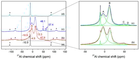 The 27Al MAS NMR spectra were obtained using a Bruker AVANCE III 400 WB spectrometer operating at 9.4 T with a spinning rate of 10 kHz. A recycle delay of 2 s was used along with a 4 mm double resonance MAS probe. The chemical shift values for 27Al nuclei were determined with reference to a 1 M aqueous solution of Al(NO3)3.