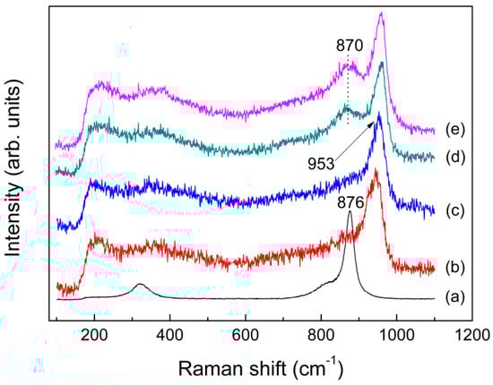 Raman spectra of molten: (a) K2MoO4 at 1273 K; (b) K2Mo4O13 at 1023 K; (c) KAl(MoO4)2 at 993 K; (d) fast; and (e) slow quenched KAl(MoO4)2.