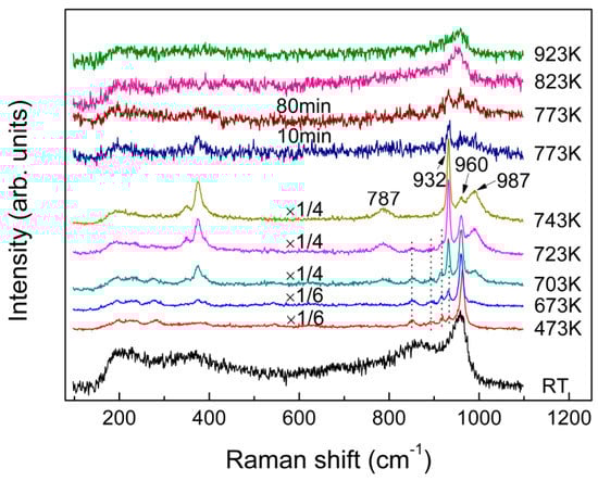 Figure 7 compares the in-situ Raman spectra of the fast-quenched sample recorded at various temperatures from room temperature to 923 K. As shown in Figure 7, new peaks started to appear at 851, 894, 918, 933, and 962 cm−1, as the quenched glass was heated to 473 K. With further increase in sample temperature to 743 K from 473 K, the band at 960 cm−1 gradually split into two peaks at 932 and 987 cm−1. As a result, the band at 932 and 987 cm−1 were enhanced with temperature before occurrence of the melting process at 773 K. Interestingly, the line shapes and varying trend of the three peaks at 932, 960 and 987 cm−1 with increasing temperature from 473 K to 743 K are similar with what occurred for the effect of quenching rate and annealing on the three main peaks at −10.9, −4.5 and 13.3 ppm of the NMR spectra in Figure 5b–d, while the Raman peak at 960 cm−1 finally became dominated after the sample being melted. In addition, another peak at 787 cm−1 started to appear at 703 K and it grew slightly as the sample temperature increased. It is well known that the glass will crystallize when being annealed, followed by structural ordering, and an increase in atomic motions and interatomic distances. Consequently, the atoms are capable to shift larger displacements and the internal stress near “switched-bond defect” begins to relax. Finally, the sample was converted to a state with a minimal deformation stress from the structural network of glass. Furthermore, the fast-quenched sample after being annealed at 723 K for 80 min is examined by XRD, as shown in Figure 1b, which cannot be simply indexed to any identified crystal phases. Therefore, the Raman peaks at 851, 894, 918, and 962 cm−1 observed at 723 K are believed to be related to some metastable phase, even though the attribution of their corresponding vibrational modes remains unknown. Figure 5d shows the 27Al NMR spectrum of the fast-quenched sample after being annealed at 723 K for 80 min, which has an asymmetric and featureless band at around 13 ppm together with the peak related to crystallization. It can be determined that this metastable phase is a transition state intermediate between glassy and crystalline states. Compared the peaks in Figure 5a,d, the band at around 13 ppm could be qualitatively confirmed as the six-coordinated Al in metastable phase. In addition, according to their temperature-dependent Raman spectra, the melting point of the fast-quenched sample was about 160 K lower than that of the crystalline sample. Since the fast-quenched sample was prepared under rapid cooling conditions, it contained considerable residual defects and stresses. Thus, the sample was thermodynamically unstable and is easier to melt compared with the crystalline sample prepared through slow cooling.