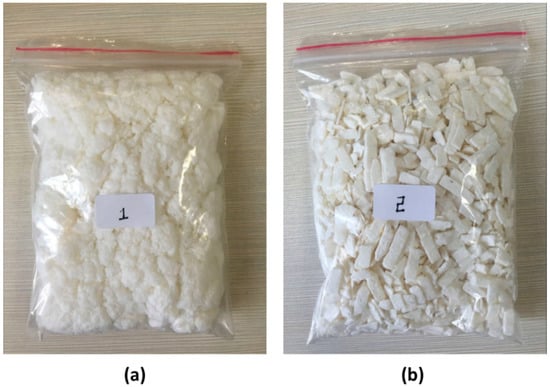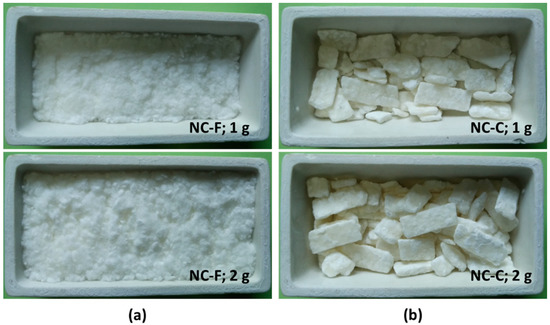Comparison of the macroscopic product structures. (a) White soft fiber nitrocellulose (NC-F); (b) white chip nitrocellulose (NC-C).