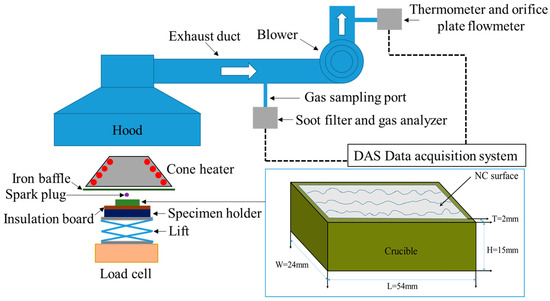 The experimental setup of the cone calorimeter in the current study complied with ISO 5660 [25]. Figure 2 presents a schematic of the experimental setup. An iron baffle is horizontally arranged under the cone heater to prevent the samples from being affected by the radiant heat flux before the commencement of the tests. An insulation board with dimensions of 100 mm × 100 mm × 10 mm (length × width × height) was positioned on the conventional specimen holder to shield the scale from the elevated temperature. The NC samples were put into a cuboid ceramic crucible which is shown in amplified part of Figure 2 and the crucible was placed horizontally on the insulation board. The crucible is 15 mm in height, 2 mm in thickness, and has an open rectangular area of 1000 mm2. For each test, initial sample surface area keeps consistent. Standard area mentioned in ISO 5660 [25] is 94 × 94 = 8836 mm2. Previous research has shown that a reduction in the surface area of cone calorimeter test specimens does not significantly affect their fire behavior [26]. A lift was positioned under the specimen holder for adjusting the distance between the upper surface of the sample and the base of the cone heater. A spark plug was positioned above the sample surface for piloted ignition. An electronic scale (Shimadzu UW 6200H) with weighing capacity of 6200 g and accuracy of 0.01 g was placed at the bottom to monitor the mass loss of the sample. The calibration of each part of the cone calorimeter is carried out according to ISO 5660 [25].