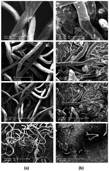The microcosmic structures of four different magnifications, examined by scanning electron microscope (SEM), are exhibited in Figure 4. At the high magnification (20 μm scale) NC-F appears smooth surface except some minor flaws and NC-C presents its self in a molten and adhesion state. The diameter of the fibers in both structures is in the proximity of 20 μm. At the medium magnifications (50 μm and 100 μm scales), the twining fibrous micro structures are easily observed for NC-F, while the fibers in NC-C appear to be segmented. The space between the fibers in NC-F is observably larger than in NC-C. At the low magnification (200 μm scale), the contrast between the two structures is even greater. The agglomeration of NC fiber in NC-C is much denser than in NC-F. It is noted that the SEM images in Figure 4 are very similar to that of micron-sized NC fibers examined by Sovizi et al. [20].
