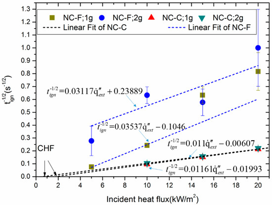Figure 5 shows that the linear fitting between and incident heat flux is unsuccessful for NC-F. The results of NC-C fit well with Equation (6) and the corresponding CHF for 1 g NC-C and 2 g NC-C are 0.55 kW/m2 and 1.72 kW/m2, respectively. The difference of the CHF is attributed to the variation of the convective coefficient as shown in Equation (5). Besides, the ignition times of 1 and 2 g of NC-C, with external radiation of 5 kW/m2 predicted from the fitting line are 688 s and 418 s, respectively. However, 2-g NC-C samples under the actual measurement were not ignited within 600 s. This may be attributed to air convection produced by the open cone calorimeter affecting the heat accumulation of the samples.