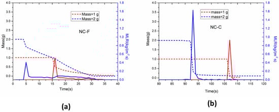 The typical mass loss rate intensity (MLRI) curves of two NC samples at 10 kW/m2 are shown in Figure 6. A high peak of MLR was recorded immediately after spark ignition. The flaming combustion consumed 20–50% of the initial mass for NC-F and 80–90% for NC-C. The peak mass loss rate intensity (PMLRI) of NC-C is much greater than that of NC-F. The burning period of NC-C was very short, in a matter of less than 3 s. The burning period of NC-F seemed to last much longer, for about 20 s or longer.