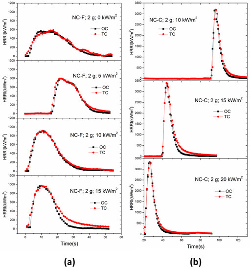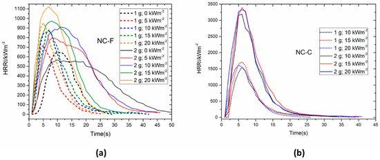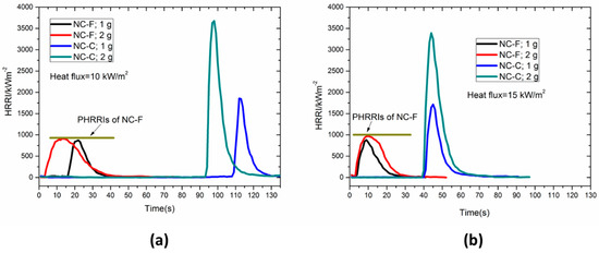 It can be seen from Figure 8a that the PHRRI of NC-F increases with increasing external radiant heat flux, and the increasing rate also goes up with the increasing radiant heat flux. With larger radiant heat flux, the initial growth rate of HRR, or d(HRR)/dt, and the PHRRI become higher, and the combustion duration becomes shorter. In Figure 8b, similar curves of HRRI is observed for a fixed mass under three different radiant heat fluxes. The HRRIs of NC-C have a weak relationship with external heat flux, but are affected significantly by the sample mass.