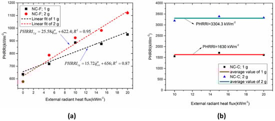 Figure 9 presents the trends of PHRRI with the increasing external radiant heat flux. Generally, the magnitude of PHRR of NC-C is larger than that of NC-F. The PHHRI of NC-F increases as a function of external radiant heat flux. By linear fitting, the relationship between PHRR and external radiation for NC-F can be expressed as: