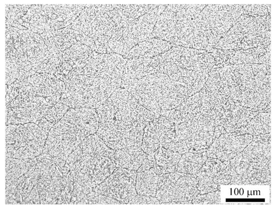The cylindrical compression specimens of 12 mm in height and 8 mm in diameter were cut from the as-annealed plates and the surface finish reached Ra3.2. The specimens were compression deformed at temperatures ranging from 1223 K to 1423 K in an interval of 50 K and strain rates of 0.01 s−1, 0.1 s−1, 1 s−1, and 5 s−1 on a Gleeble-1500D thermo-mechanical simulator. To reduce the friction between the specimen and the die, tantalum foil with a thickness of 0.05 mm has been inserted between them. Each specimen was preheated to 1473 K, held for 180 s for homogenization, and was then cooled to the pre-set deformation temperatures at the cooling rate of 10 K/s in order to simulate the practical industrial process. All the specimens were held for 20 s to eliminate thermal gradients before compression, and then they were deformed to the total true strain of 0.9 and water-quenched immediately. The specimens after deformation were cut along the compression axis and the surfaces were prepared for optical microscopy observation. After normal grinding and polishing processes, the specimens were etched with saturated picric acid. Figure 1 shows the quenched microstructure after holding at 1473 K for 180 s. It can be seen that the microstructure before deformation is homogeneous and the average grain size is about 110 μm.