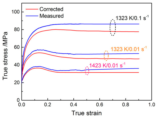 where , σ, m, r0, h0, and ε are the corrected flow stress, measured flow stress, friction factor, initial radius, initial height of specimen, and measured strain, respectively. In this formula, the m value is a key parameter for calculating the corrected flow stress data. The detailed calculation process has been described in a previous work by the authors [33]. Figure 2 shows the flow curves before and after friction modification. It is easy to see that the flow stress after modification is much lower than the measured ones, which indicates that the effect of interfacial friction between the specimen and die on the flow behavior is significant. Additionally, if the actual temperature rise is obvious, the flow stress data should be corrected using a linear interpolation between logσ versus 1/T (T is the temperature, K) to reduce the effect of the temperature rise [34]. In this work, the temperature rise for the pre-set deformation temperature can be detected on the flow curve obtained at the strain rate of 5 s−1 and temperature of 1223 K, and the temperature increment is only about 5 K. After the modification, the change on the flow curve is not remarkable.