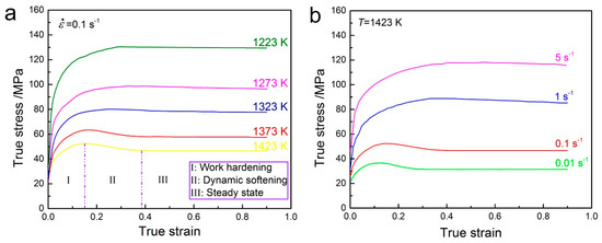 Typical corrected true stress-true strain curves of 70MnSiCrMo carbide-free bainitic steel hot-deformed at (a) different temperatures with a strain rate of 0.1 s−1 and (b) different strain rates with a temperature of 1423 K.
