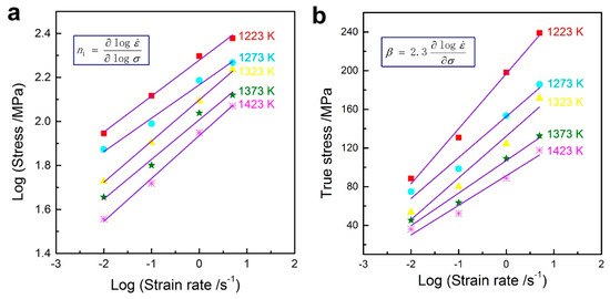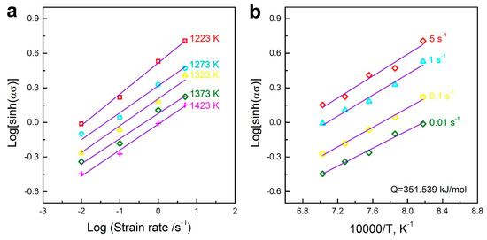 Figure 5a shows the plots of log[sinh(ασ)] vs. log at different temperatures. It is seen that the fitting lines match well with the experimental data, and the parallel relationship of these straight lines indicates that the selected α value is appropriate in the present working condition. By averaging the inverse of the slopes of the fitting lines, the value of n is determined as 4.233.