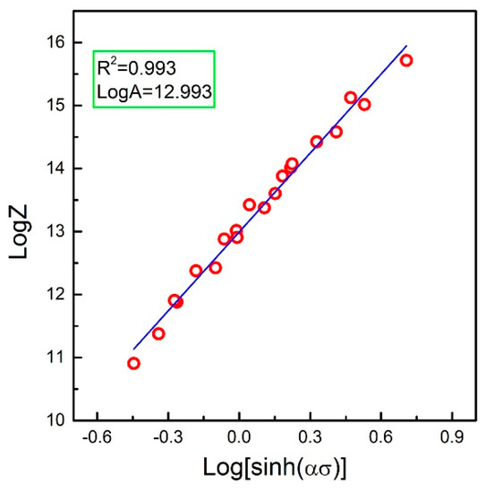 where the value of A can be easily obtained. By inputting the peak stress, strain rate, temperature, and material constants (α, n, and Q) into Equation (11), the relationship between ln[sinh(ασ)] and logZ can be drawn, as shown in Figure 6. The flow stress increases with increasing the Z parameter. Meanwhile, a good linear fit for the data plots is observed, and the value of logA can be determined by the intercept. Hence, the parameter of A is defined as 1.371 × 1011.