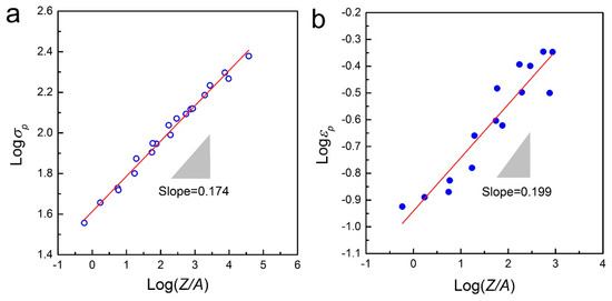 For simple representation, the peak stress and the corresponding strain, εp, can be expressed as a linear relation with log(Z/A) [37,40]. Figure 7 shows the plots of logσp vs. log(Z/A) and logεp vs. log(Z/A) respectively. By regression analysis of the data points, the following equations are obtained: