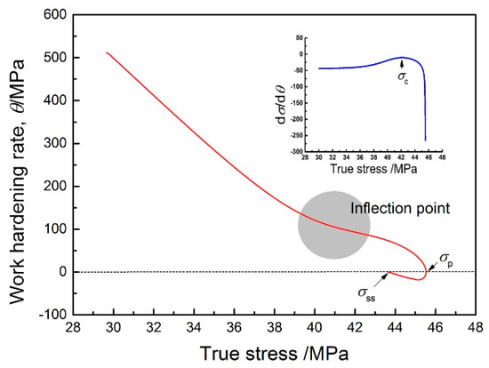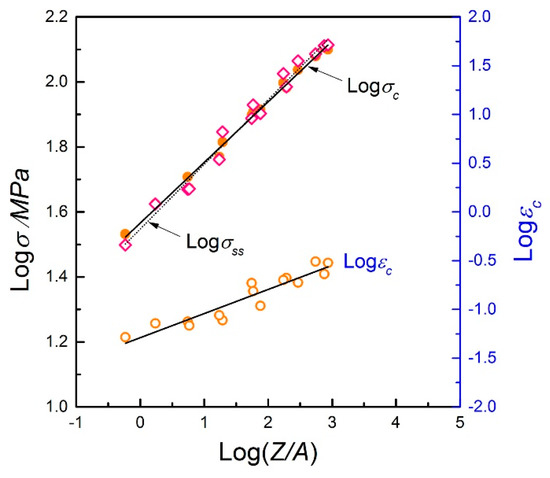 Besides the peak values, the critical stress (σc), critical strain (εc), and steady stress (σss) obtained from the flow curves are also quite important characteristic parameters to describe the softening behavior. The values of σc and εc represent the critical condition for the initiation of DRX, while σss is related to the microstructural mechanism during hot deformation. In this work, the values of σss are identified from the relationship curves of θ vs. σ at different deformation conditions. Due to the difficulty in reading the value of σc directly, the method proposed by Poliak and Jonas [41] is employed, which involves plotting dθ/dσ vs. σ. Figure 8 gives an example to evaluate the values of σc and σss. The value of εc can be obtained by mapping the σc value back into the flow curve. These characteristic parameters can also be represented as a function of log(Z/A), as shown in Figure 9, which successfully builds the relationship between the flow behavior and working variables. They are expressed as