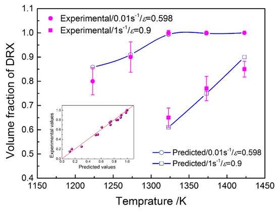 Comparisons between the predicted and experimental DRX volume fractions at strain rates of 0.01 s−1 and 1 s−1. The inset figure is the correlation between the predicted and experimental ones for more working conditions.