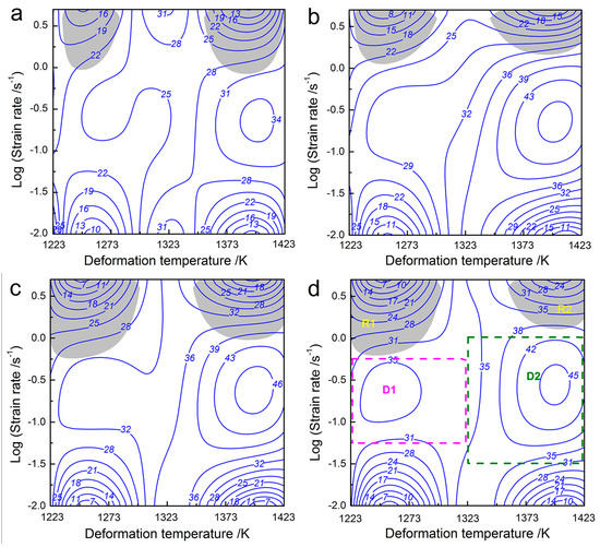 Processing maps of 70MnSiCrMo carbide-free bainitic steel at various strains: (a) 0.162; (b) 0.357; (c) 0.598; (d) 0.9. The square domains (D1 and D2) possess a high efficiency of power dissipation and are considered to be the suitable processing windows, while the gray regimes (R1 and R2) indicate that it is unsafe for processing.