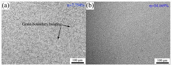 To evaluate the precision of the developed DRX model, the metallographic observation is performed under typical conditions and the microstructures obtained at 1373 K and 0.1 s−1 with low strains are shown in Figure 12. It can be seen that the DRX volume fraction indeed increases as the strain increases, and the values at strains of 0.162 and 0.357 are about 12% and 65%, respectively. More comparisons between the experimental and the predicted data have been carried out, as shown in Figure 13. As is seen, the predicted DRX volume fractions (the plots) agree well with the experimental ones (the points). The calculated value of R is 0.985 (Figure 13 inset), which confirms that the model can be applied to predict the volume fraction of DRX for 70MnSiCrMo carbide-free bainitic steel in a hot working process with good precision.