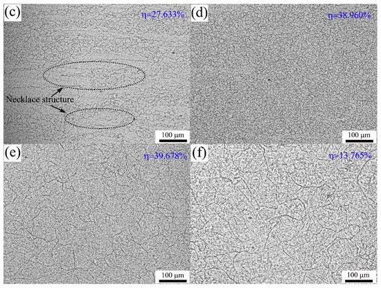 Figure 15 shows the typical microstructures of 70MnSiCrMo carbide-free bainitic steel after hot deforming at different temperatures and strain rates. Figure 15a presents the microstructure obtained at the condition of 1273 K/0.01 s−1. In this figure, the uniform DRX grains are visible and the average grain size is about 47 μm, illustrating that the complete DRX microstructure can be developed at a low enough strain rate, though, at a low deformation temperature. It is particular noted that most grains exhibit irregular shapes characterized with wavy or serrated grain boundaries. Therefore, it is deduced that the growth of DRX grains at this state is not terminated. Meanwhile, the corresponding power dissipation efficiency is only 7.754%, which further confirms that the present processing parameters are not optimal for hot working. The occurrence of wavy or serrated grain boundaries indicates that the grain boundary bulging is the nucleation mechanism of DRX [51,52]. Figure 15b shows the microstructure of the steel deformed at a strain rate of 0.1 s−1 and a temperature of 1273 K with a power dissipation efficiency of 34.169%. It can be seen that the original coarse grains have evenly transformed into the newly formed equiaxed DRX grains with a small size of 16 μm, indicating that high energy dissipation in this condition is used for the nucleation of DRX. Compared with that in Figure 15a, the degree of DRX is slightly decreased but the grain size is much finer. This is because the high strain rate provides more nucleation sites for DRX and therefore promotes the DRX formation. However, when the strain rate is increased to 1 s−1, as shown in Figure 15c, the microstructure represents some necklace structures which are featured by many newly fine grains along original grain boundaries, and thus the primary grains are gradually decorated by the DRX grains but not completed. The degree of DRX is obviously decreased. Moreover, uneven deformation has occasionally occurred at this condition and therefore it is located in the instable regime. Hence, the DRX behavior is very sensitive to the strain rate and the excessive strain rate goes against the growth of DRX grains. With increasing the temperature to 1423 K, coarser DRX microstructures are obtained, as shown in Figure 15d,e, and the mean grain sizes are about 18 μm and 58 μm, respectively. The higher the deformation temperature, the larger the driving force for DRX nucleation, the faster the migration rate of the strain-induced grain boundary, and the greater the DRX degree. Figure 15f shows the microstructure of the steel deformed at a strain rate of 0.01 s−1 and temperature of 1473 K where the power dissipation efficiency is 13.765%. A significant number of irregular DRX grains are found and the grain size is increased to 92 μm. This is because the low strain rate provides enough time for new grains to grow at high temperatures. To reveal the variations of the DRX grain size with deformation conditions, the correlation between the grain size (DDRX) and the dimensionless parameter, Z/A is developed, as shown in Figure 16. As seen, the relationship between them can be analyzed by linear regression and thus expressed by Equation (27). Using this equation, one can control and predict the grain size of 70MnSiCrMo carbide-free bainitic steel after hot deformation.
