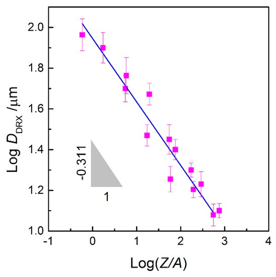 Correlation between logDDRX vs. log(Z/A) at various deformation conditions.